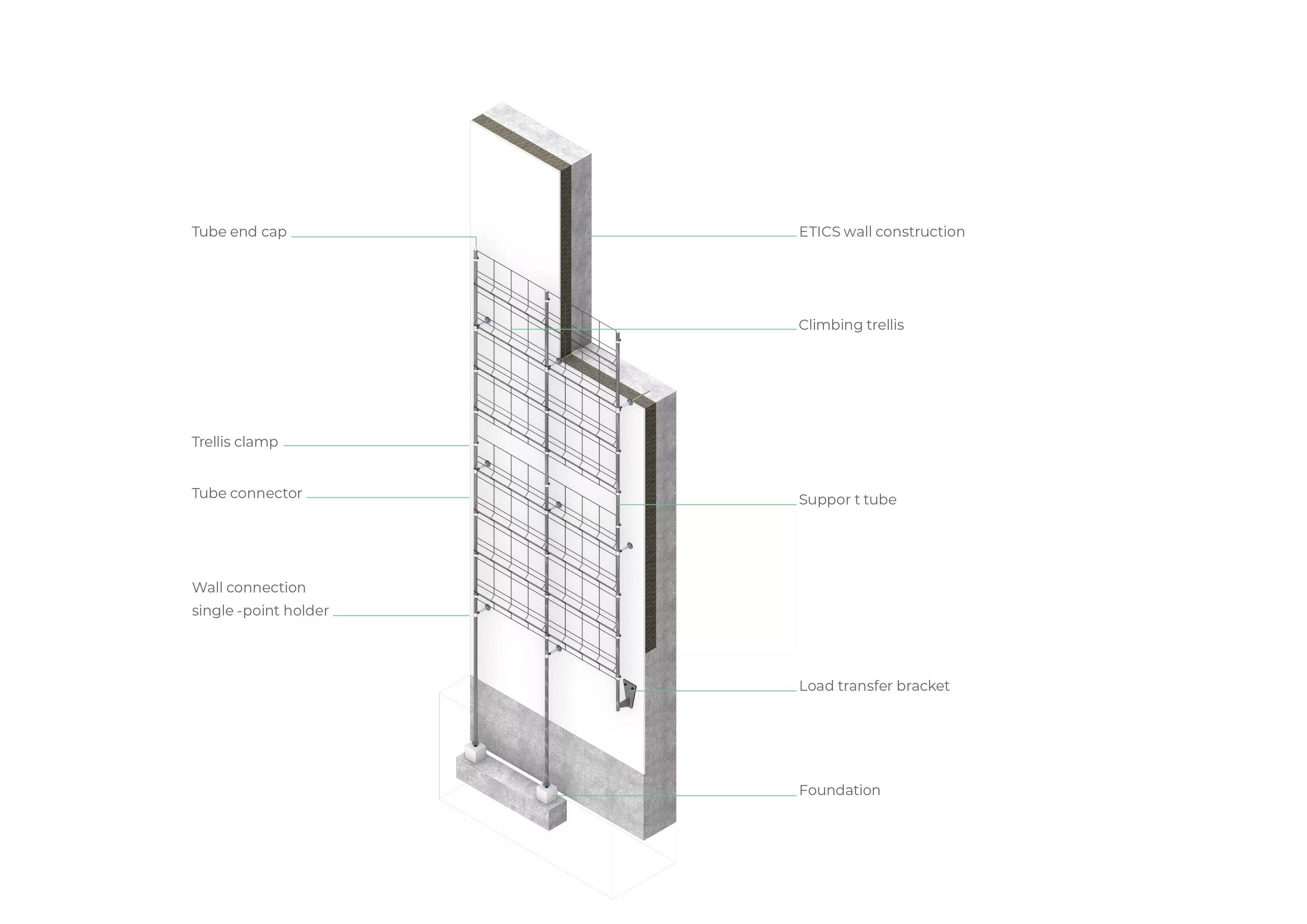 A south-facing slope or a shaded north wall, a single-storey office building or a large industrial hall – just as building types, locations, and weather conditions vary, so do our plant recommendations for your ClimbingSYSTEMS. The planting scheme on this page provides an initial overview of different growth heights and spread patterns. Our experts offer personalised advice on plant selection and maintenance to ensure a healthy, long-lasting green façade.